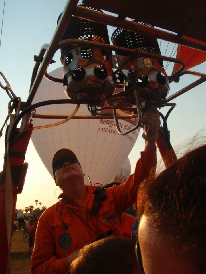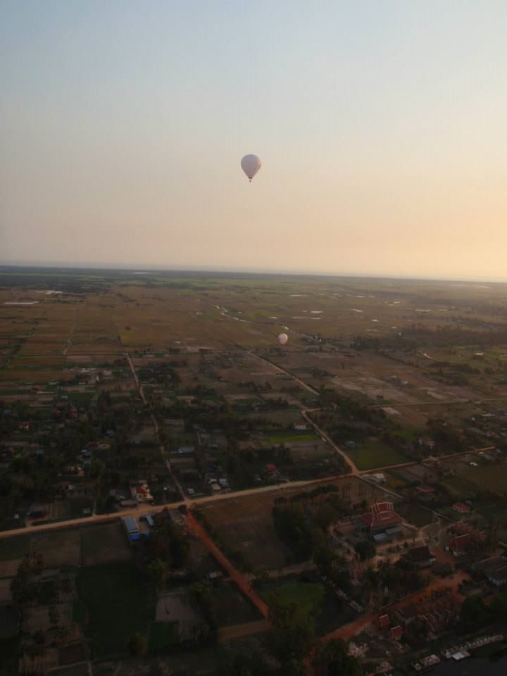 A resident enjoying the last of the day’s sunlight from his top floor balcony was fixed on us approaching. Looking very much like someone who had already witnessed this too many times before, he stood his ground in a grim game of chicken. Barely perceptible twitches began to break out on his otherwise perfect poker face. Our pilot showed no signs of changing course; we were heading straight for the roof top. All around me in the basket people began shouting and pointing; still the man remained composed and still our pilot refused to budge. Finally, all hell broke loose with nothing short of a mutiny onboard the balloon; everyone grabbing what they could to in an attempt to avert the impending disaster. The man had by now lost his composure and was jumping up and down, frantically waving his arms and shouting Khmer obscenities. The pilot seemed genuinely panicked and at last made an effort to abort what was clearly a daily game between the two.