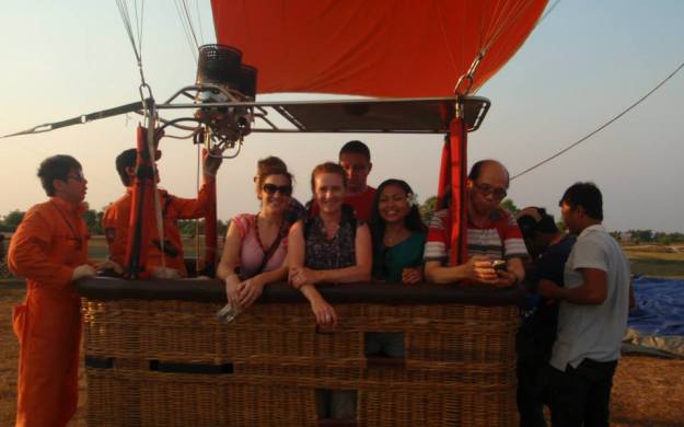 Our jeep turned into a bumpy field on the outskirts of Siem Reap and sped across to where three hot air balloons were majestically swaying in the orangey light, their baskets tethered by a small number of young Cambodian boys with sinewy arms . We screeched to an unnecessarily dramatic halt, dust clouds were sent billowing into the air, up our noses and down the back of our throats. The prospect of a sunset flight with the amazing Angkor Wat as a backdrop was intoxicating.