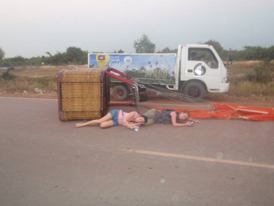 We bumped down into the middle of the road, finally settling on the third bump. I wasted no time and jumped out of the basket; a motorbike swerved to avoid me. A fellow passenger followed in hot pursuit but we were met with piercing screeches as the basket began to lift once more with the decrease in weight; the remaining passengers were quickly stopped from vacating. The balloon was still undecided as to whether or not to stay airborne or come down gracefully. With the basket now being tethered by the locals to prevent those still onboard going off on another adventure, the balloon had finally had enough and began to fall. The final challenge of this whole sorry episode was to find safety from the voluminous material. Fast-moving vehicles started getting caught up in it along with now hidden standers-by such as us. The basket was on its side; the ladyboy was distraught.