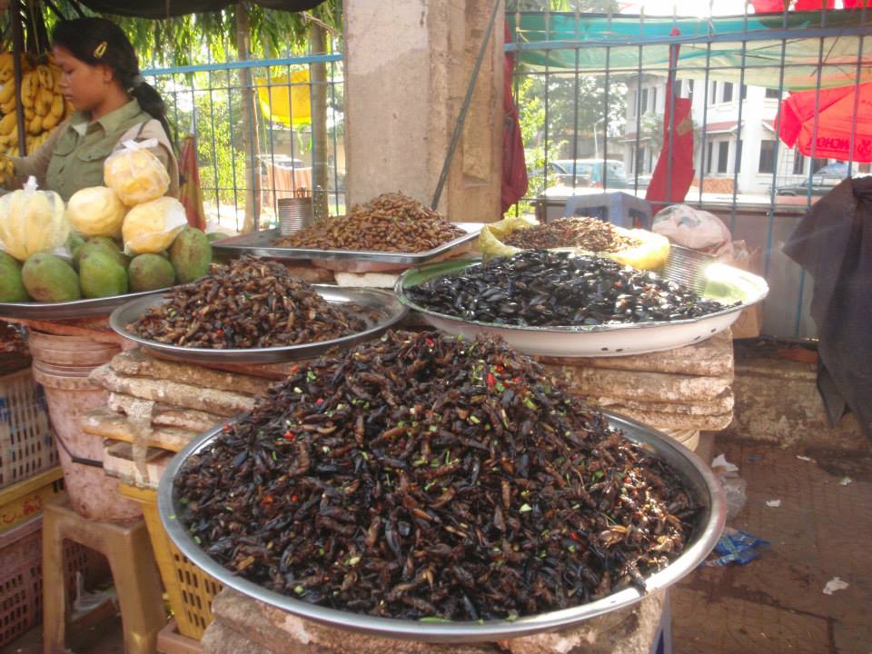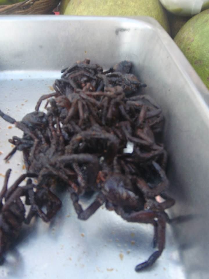 The deeper into Cambodia I travelled, the less familiar everything became; terrain, customs, food. You don’t have to venture too far from Phnom Penh for the chance to sample the infamous deep fried tarantulas from the smorgasbord of many and varied arachnids and invertebrates on offer. I had, of course, read all about this and was fully convinced I’d be brave enough to try them. However, nothing I’d ever seen or am ever likely to see looked quite so unappetising as the huge vats piled high with cold, rock hard, hairy, black spiders.