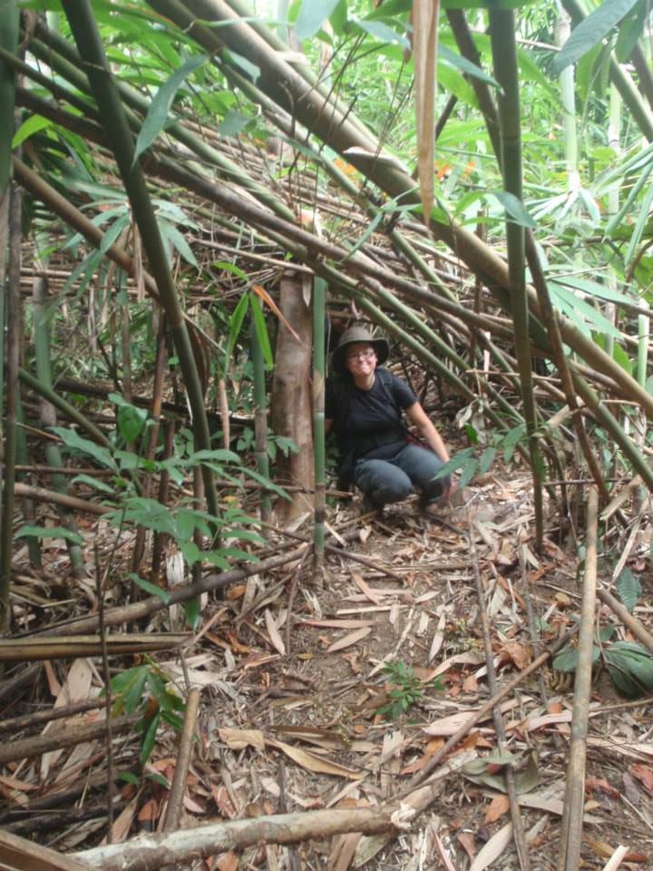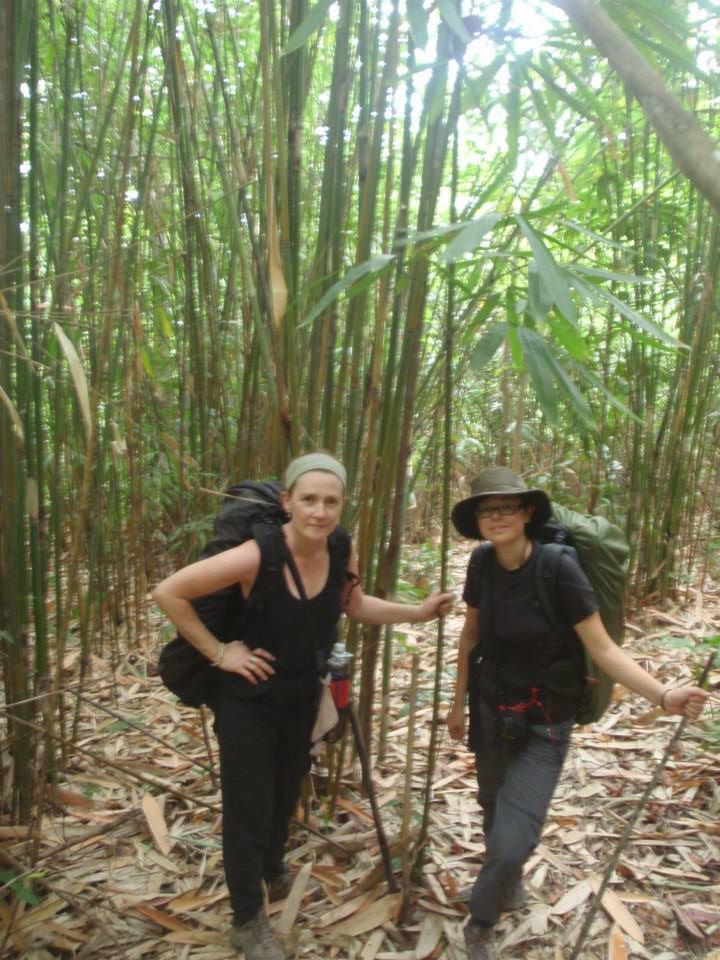 Funny old things bamboo but sadly, not in a humorous way. Razor sharp once cut, they grow out at odd angles when still alive and pile up on the forest floor covertly when dead. They are, therefore, perfect for launching surprise attacks from both above and below. Two-pronged attacks were frequent; at times narrowly avoiding our eyes, we’d get hit by the sharp end of a cut bamboo pole that was sticking out at head height and while tending to the wound we’d lose our bearings and get tripped up by rogue poles that had fallen underfoot. The worst was when there was a number of poles on the ground, leading to a balancing dance not unlike that of Canadian loggers attempting to stay upright as logs spin furiously beneath them.
